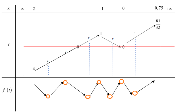 Gọi \(a,\,\,b,\,\,c\) là các điểm cực trị của hàm số \(y = f\left( x \right)\), trong đó \( – 2 < a < \,\,b < 0 < \,\,c < 0,75\).