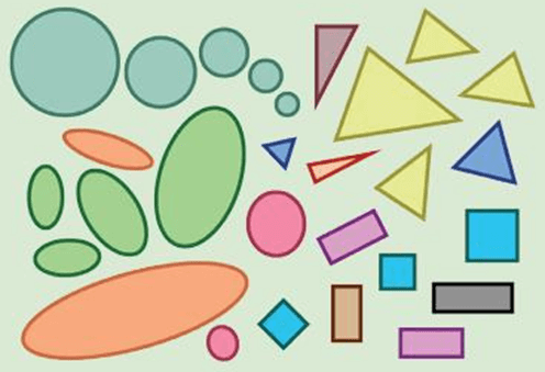 ⦁ Ta thấy trong các cặp hình vừa tìm được, có cặp hình có kích thước bằng nhau (các cặp hình tam giác màu vàng, cặp hình elip màu xanh lá, cặp hình vuông màu xanh biển, cặp hình chữ nhật màu tím) và có cặp hình có kích thước khác nhau (các cặp hình tròn màu xanh, các cặp hình tam giác màu vàng, các cặp hình elip màu xanh lá, cặp hình elip màu cam, cặp hình tròn màu hồng, cặp hình tam giác màu xanh dương, các cặp hình vuông màu xanh biển).