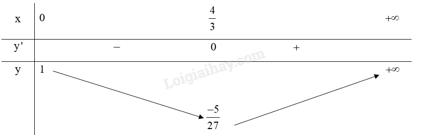 Do đó, \(\mathop {\min }\limits_{\left[ {0; + \infty } \right)} y = y\left( {\frac{4}{3}} \right) = \frac{{ – 5}}{{27}}\), hàm số không có giá trị lớn nhất.