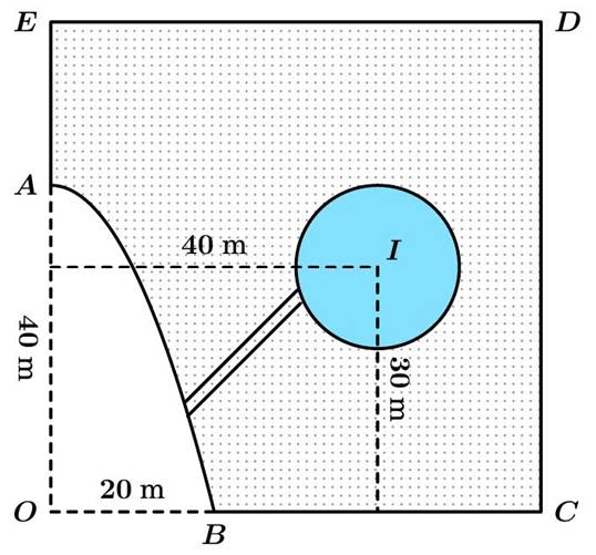 • Một cái ao có hình ABCDE (như hình vẽ), ở giữa ao có một mảnh vườn hình tròn bán kính 10m, người ta muốn bắc một cây cầu từ bờ AB của ao đến vườn. Hỏi độ dài ngắn nhất l (đơn vị mét) của cây cầu là bao nhiêu (làm tròn đến chữ số hàng phần chục), biết: